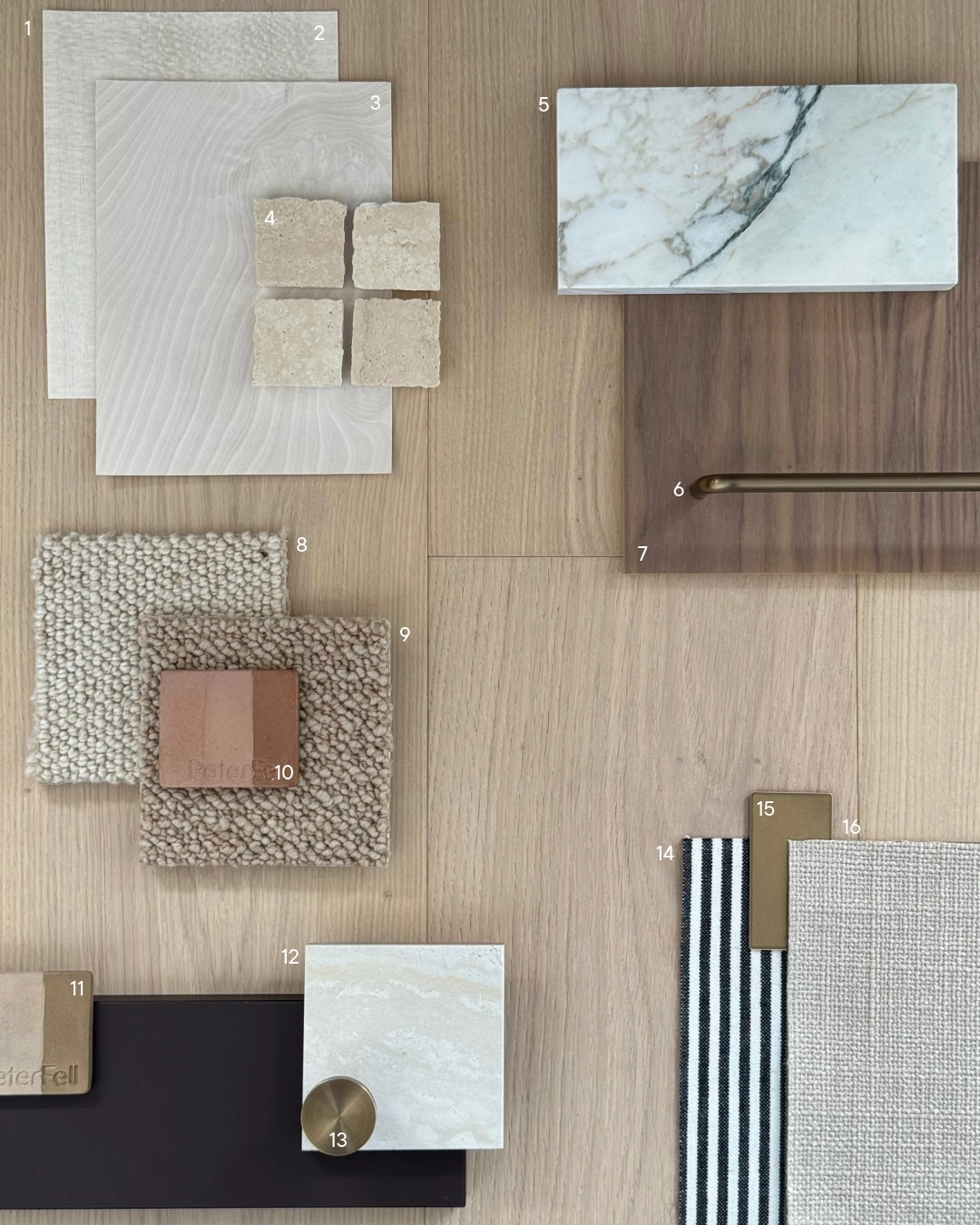 1. TRUNK - ELZA Wide | 2. TABU - Plane Veneer | 3. TABU - Radica di Madrona Veneer | 4. ABI Interiors - Ravello Travertine Square Mosaic | 5. CDK Stone - Calacatta Viola Marble | 6. Powersurge - Beam Handle Aged Brass | 7. Shinnoki - Frozen Walnut | 8. Bremworth - Buttercup Aoraki | 9. Bremworth - Parchment Levante | 10. Peter Fell – PFL 390 | 11. Peter Fell – PFL 328 | 12. ABI Interiors - Izmir Travertine Look | 13. Powersurge - Doric Pull Aged Brass | 14. Textilia - Beach Catlins | 15. Powersurge - Aged Brass | 16. Textilia - Pathway Hyde Park