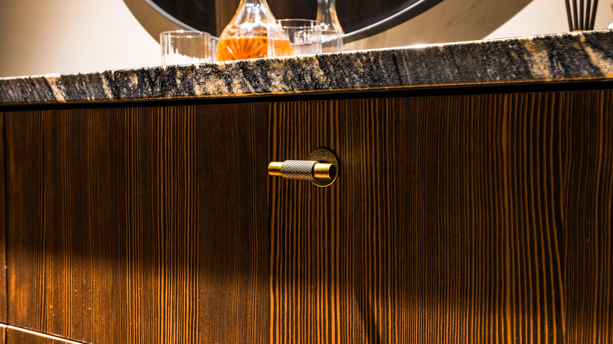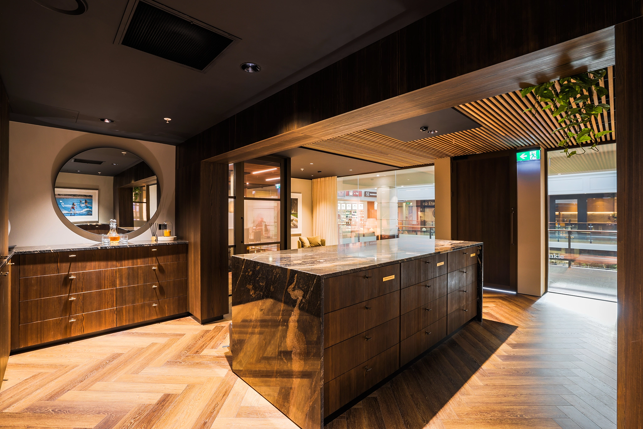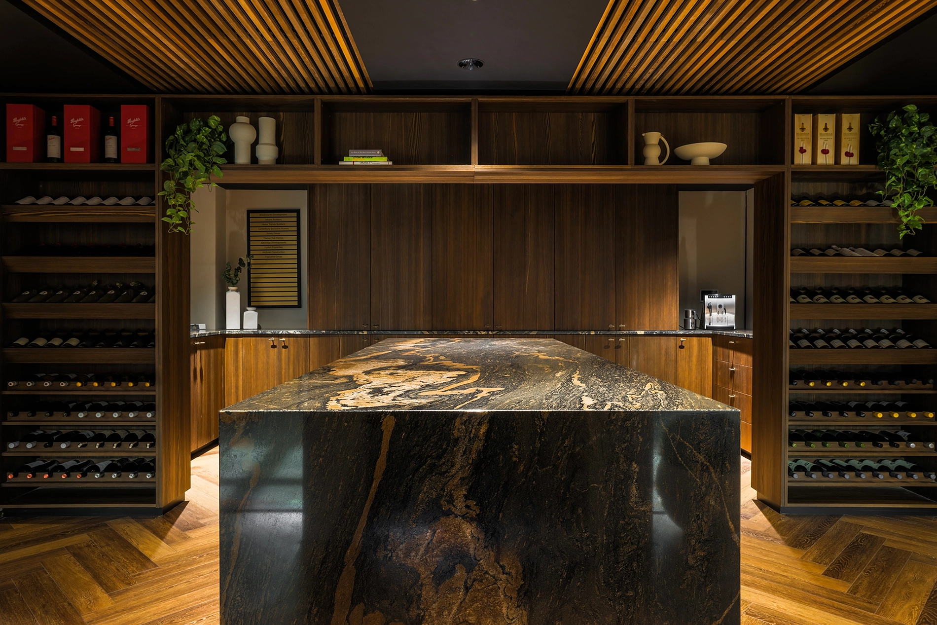 A remarkable office and meeting space reflecting high-end housing developments. Exudes comfort, confidence, and celebration. Luxurious finishes, bronze handles, warm timber, and exquisite marble create a tactile and inviting atmosphere.