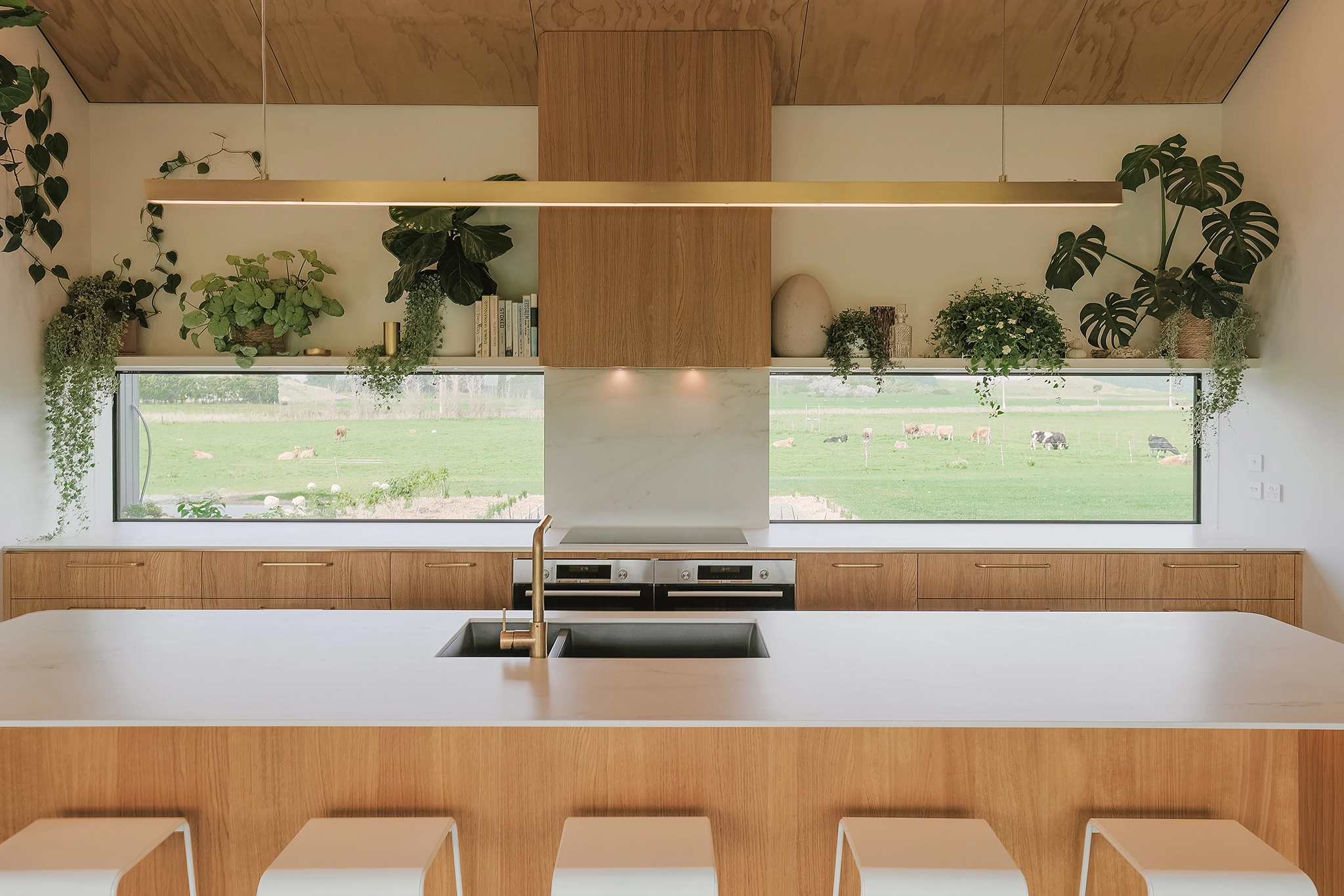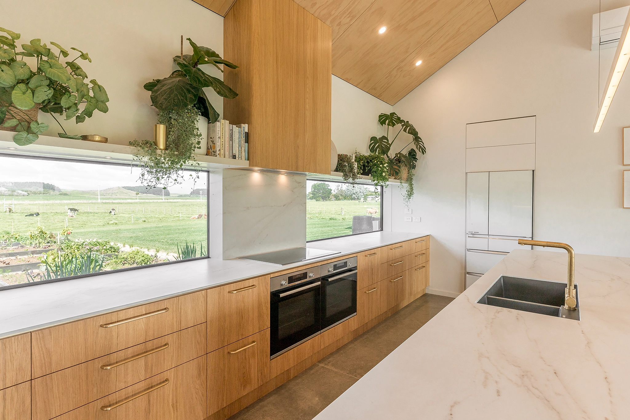 Workshop Designs chose a natural timber palette to reflect the homes rural out look. Stunning curves, stone floating shelves and brass accents really make this one pop.