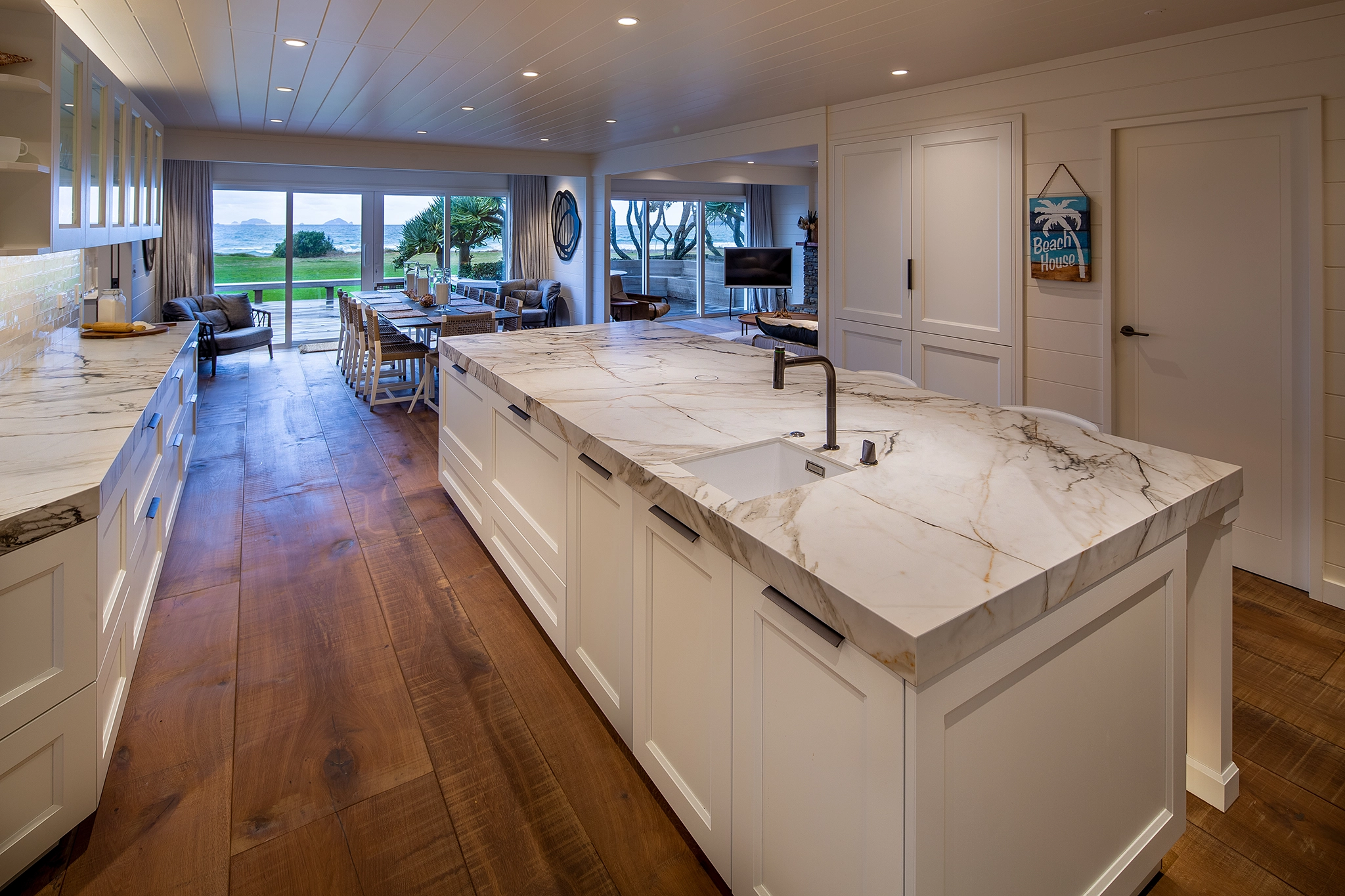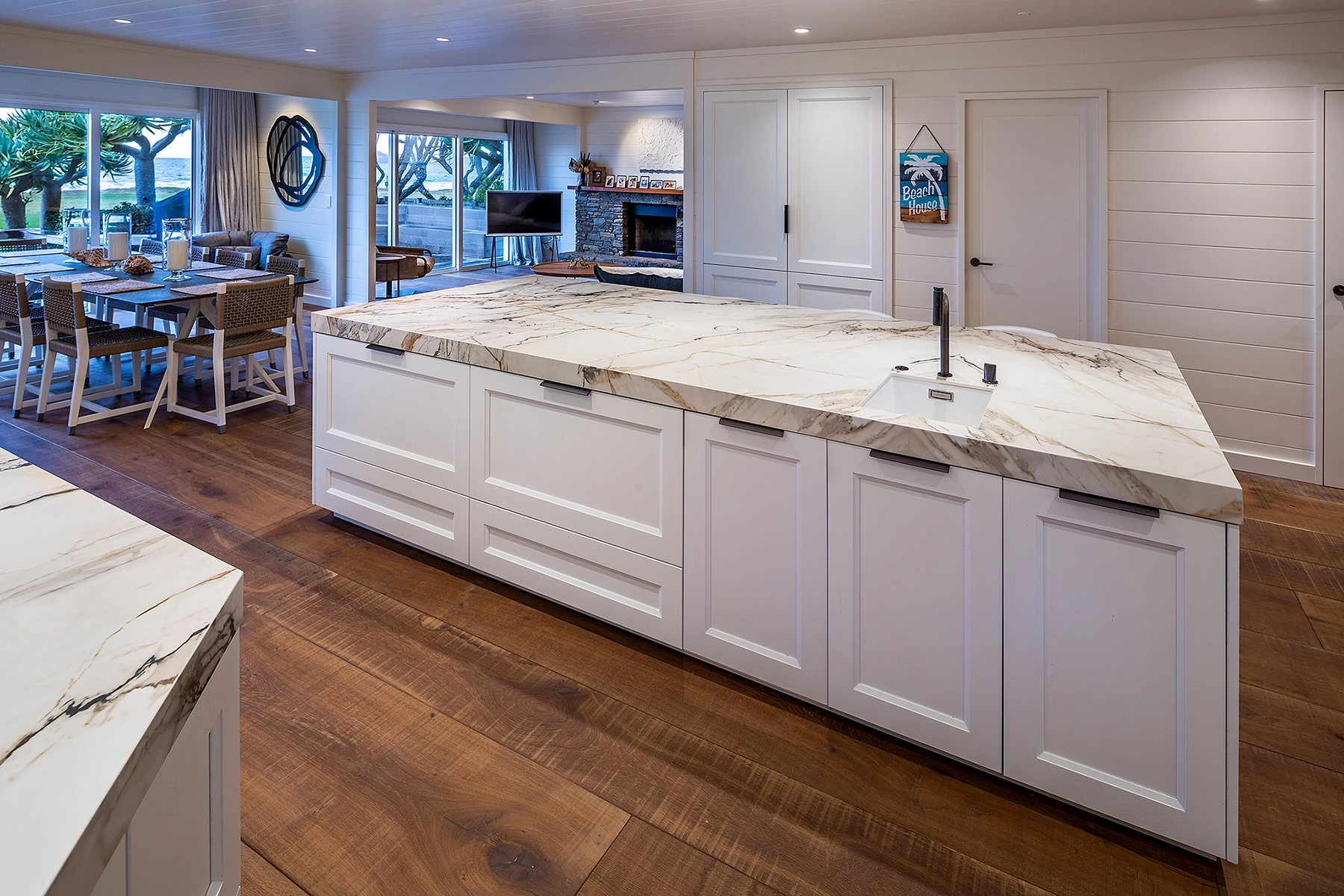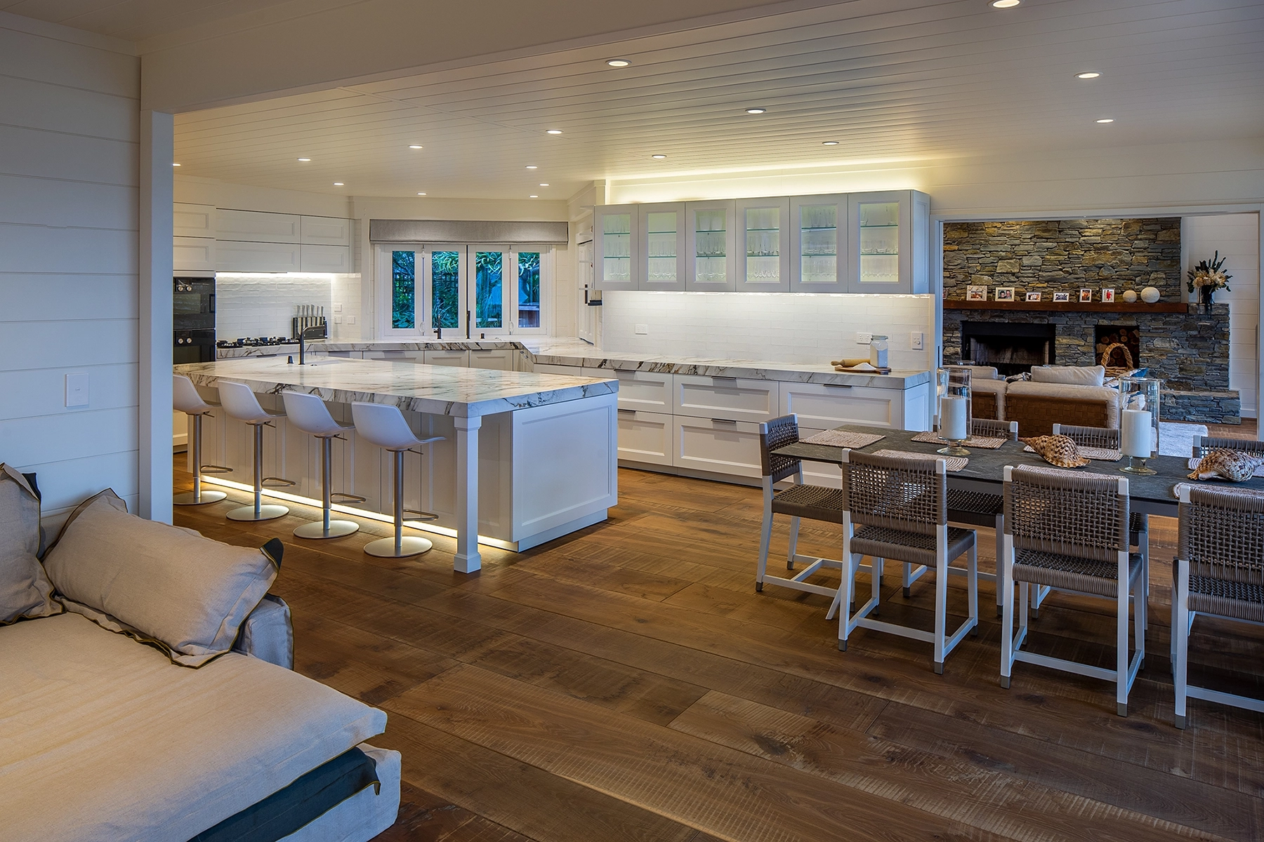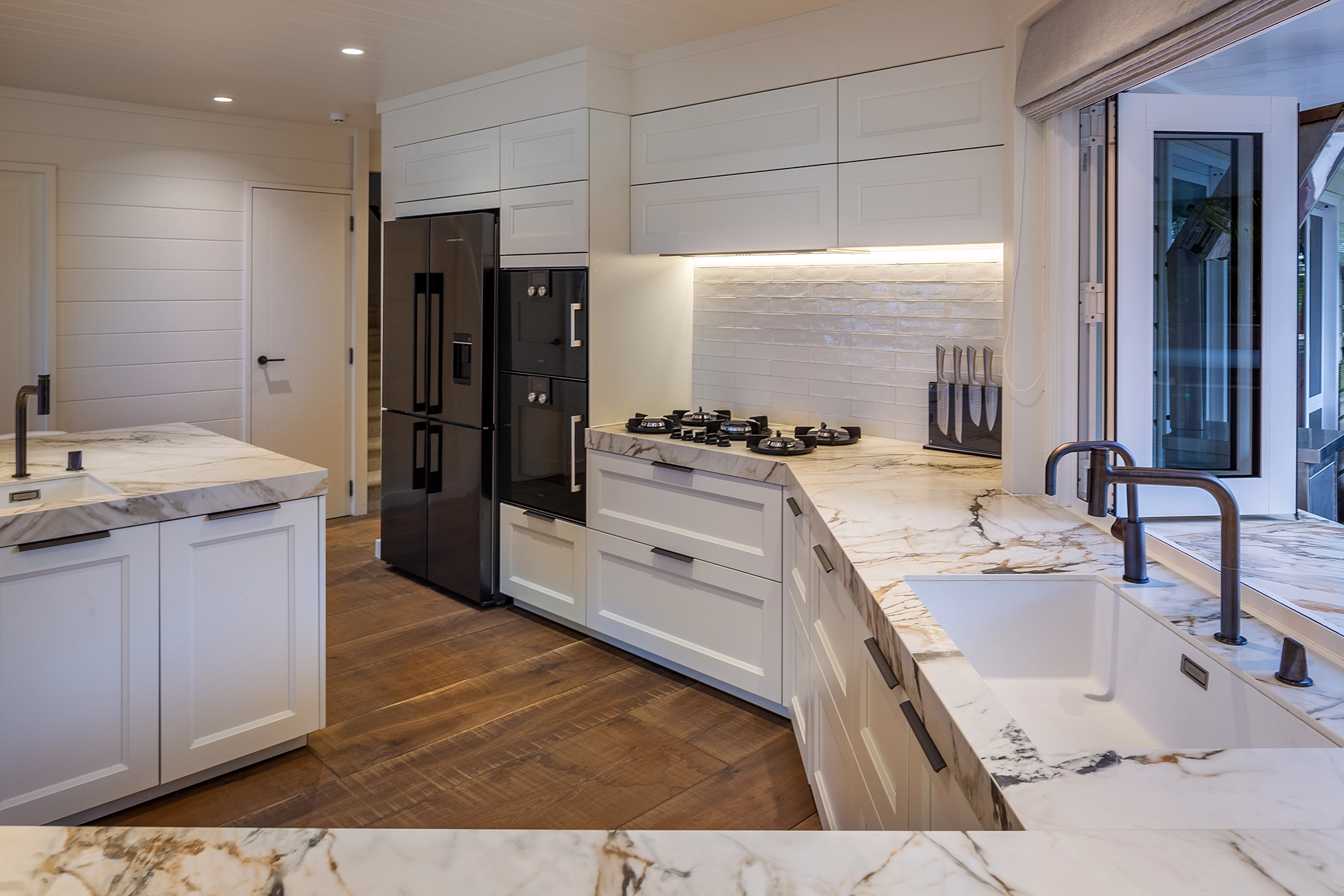 A Hamptons style makeover for this home was well achieved by German Kitchens, as mentioned by Damian the old kitchen was “cramped, undersigned, and lacked creativity, and warmth”. What a transformation that took place here, to achieve an entertainment space as well as a day-to-day area for the family, with functionality and visually beautiful materials. The stunning island that runs the length of the space, working it into the dining table, creating a flow to the outdoor area. Whitewashed walls and ceilings bringing them back to life, and the white lines in the kitchen cabinetry make for a sleek and simple aesthetic, while letting the feature pieces like the flooring and marble speak volume. The flooring is such a special feature, the hand grade bespoke flooring adds warmth and character to the space, creating a connection the beach outside. The incredible width and length of these planks accentuate the area.
