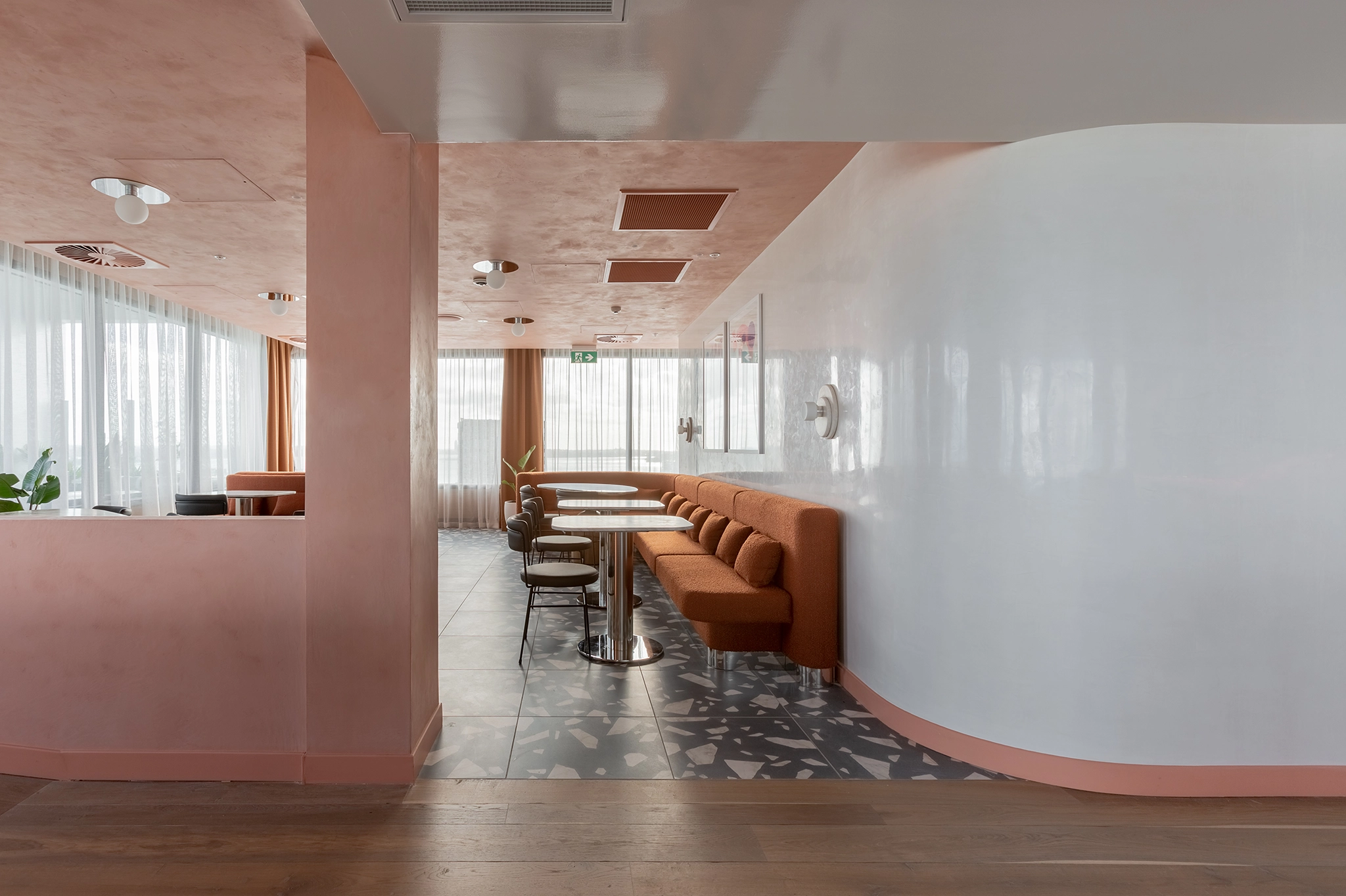 ‘Sunset is a nostalgically flamboyant rooftop bar bringing LA nightlife from the 70’s to Auckland city. A sense of playfulness is expressed through architectural curves and bold colour applications. Salmon pink ceilings, burnt orange upholstery, and chrome detailing lead guests to the panoramic sunset viewed from the plant-filled balcony.