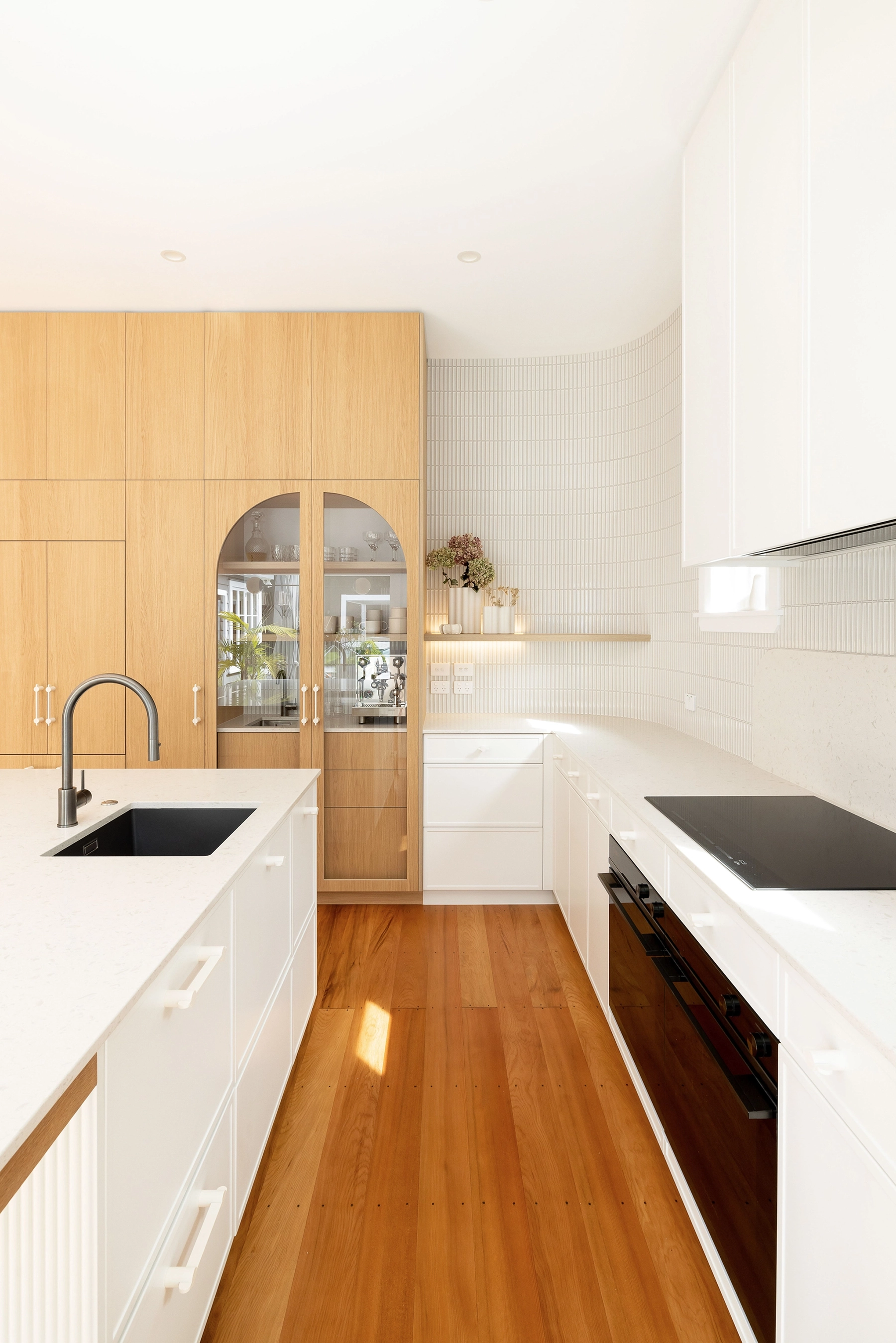 A stunning showcase of contemporary design, characterised by its elegant and inviting atmosphere. Featuring prefinished Ivory Oak timber veneer, the interiors radiate a sense of lightness and sophistication, with the soft, neutral tones creating a warm and airy feel. The sleek veneer enhances the open-plan layout, beautifully complementing the modern aesthetic while adding texture and depth to the living spaces. Large windows flood the home with natural light, seamlessly blending the indoor and outdoor environments.