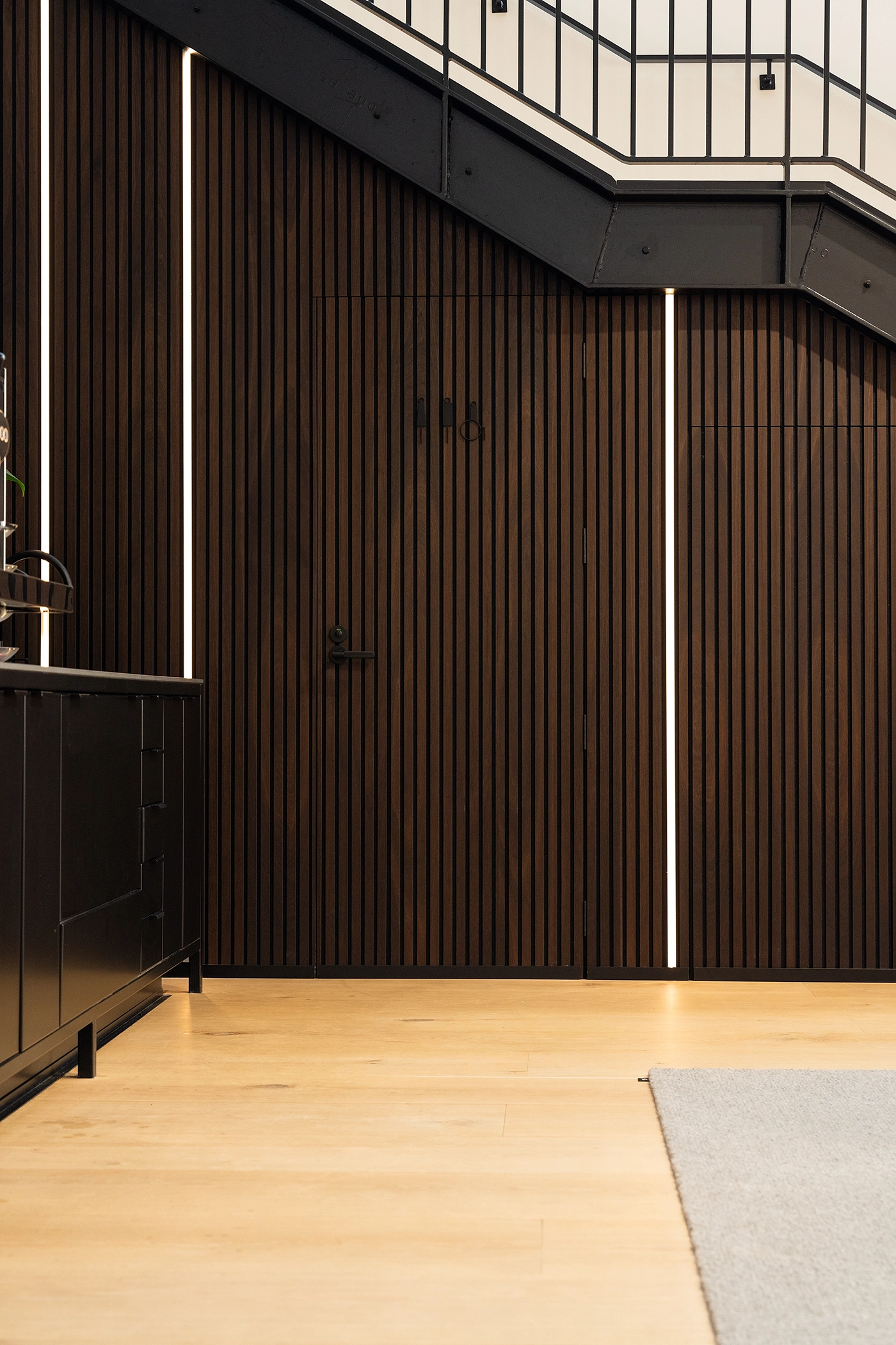 These thoughtfully integrated acoustic timber slats not only enhance the aesthetic appeal of the space but also provide effective sound absorption, creating a comfortable and inviting atmosphere. The addition of integrated lighting accentuates the timber's natural warmth and texture, making the showroom a visually striking environment. This blend of sustainable materials and modern design principles showcases how functional elements can harmoniously coexist with elegance, setting the stage for an inspiring experience at the showroom.